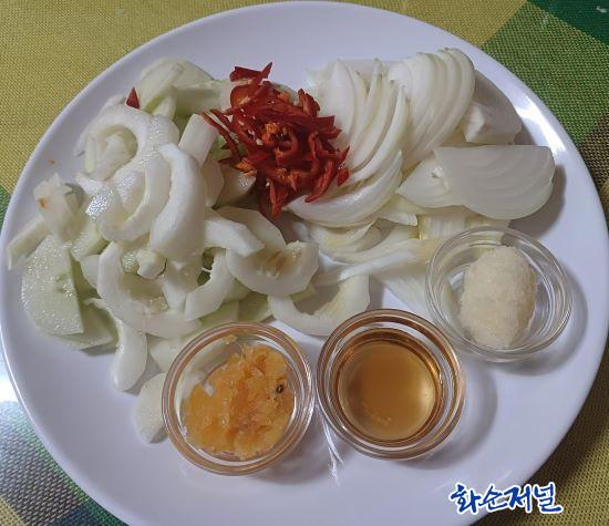 ³ë°¢³ª¹°À» ¸¸µé±â À§ÇØ ÇÊ¿äÇÑ Àç·á´Â ³ë°¢ 1°³, ¾çÆÄ 1/2°³, ¸¶´Ã 1Å«¼ú, È«°íÃß 1°³, Åë±ú ¾à°£, µé±â¸§ 3Å«¼ú, ÂüÄ¡¾×Á£ 3Å«¼ú(¸êÄ¡¾×Á£ 1.5Å«¼ú) µîÀÌ´Ù.