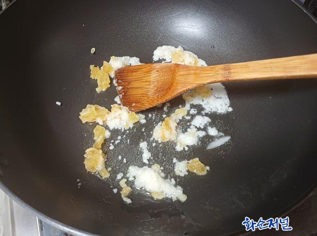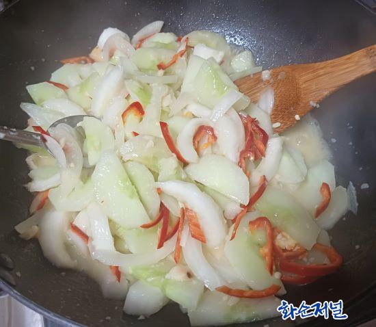 ¸ÕÀú ³ë°¢ ²®ÁúÀ» Á¦°ÅÇϰí 7mm Á¤µµÀÇ µÎ²²·Î ½ã´Ù. ±×·± ´ÙÀ½ ¾çÆÄµµ ³ë°¢ÀÇ µÎ²² ¸¸Å ½ä°í, È«°íÃß´Â ¹ÝÀ¸·Î °¥¶ó ¾ã°Ô 並 ½ä°í ¸¶´ÃÀº ´ÙÁø´Ù. ÆÒÀÌ µé±â¸§À» µÎ¸£°í ¸ÕÀú ¸¶´ÃÀ» ³Ö¾î ººÀº ´ÙÀ½, ³ë°¢ ½ã °ÍÀ» ºº´Ù°¡ ¾çÆÄ 並 ³Ö¾îÁØ´Ù.