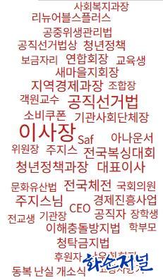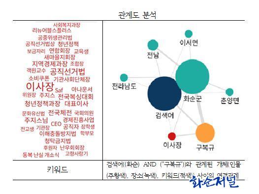 Áö³ 7¿ù ȼø ´º½º¿¡¼ ¿¬°á°ü°è¸¦ º¸¿©ÁÖ´Â ±×¸²¿¡ ³ªÅ¸³ ¿¬°ü¾î´Â 8°³´Ù. ±×Áß °Ë»ö¾î´Â (ȼø) AND ("±¸º¹±Ô"), Àι°Àº ±¸º¹±Ô, Àå¼Ò´Â ȼø±º, Àü³², Àü¶ó³²µµ. À̼¸é, Ãá¾ç¸é µîÀÌ´Ù. ÇÑÆí, ´«¿¡ ¶ç´Â Ű¿öµå´Â ÀÌ»çÀå, °øÁ÷¼±°Å¹ý, Àü±¹º¹½Ì´ëȸ, û³âÁ¤Ã¥°úÀå, ÁÖÁö½º´Ô µîÀÌ´Ù.