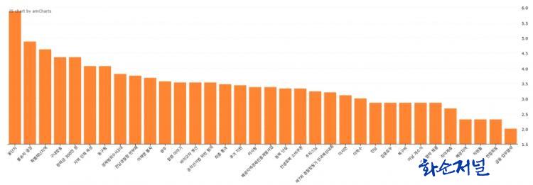 ±â»ç °Ç¼ö¿¡ ±Ù°ÅÇÑ ¸·´ë±×·¡ÇÁ¿¡¼ ÃâÇöºóµµ(ºÐ¼® ±â»ç¿¡¼ ¿¬°ü¾îÀÇ ÃâÇö Ƚ¼ö)°¡ ÀæÀº ¿¬°ü¾î¿Í ±× ºóµµ´Â ³»¸²Â÷¼øÀ¸·Î °¢°¢ Àü³² 39ȸ, À̼¸é 23ȸ, ²É´ÜÁö 22ȸ, Ưº°Àç³Áö¿ª 20ȸ, Æó±¤Áö¿ª 20ȸ, ±¤ÁÖ 18ȸ, Ãë¾à°èÃþ 16ȸ, û·Å À̾߱â 14ȸ, ÀÌÀ翵 ºÒÀÚ 12ȸ, ÀÌ»çÀå 12ȸ µîÀÌ´Ù. ¿¬°ü¾î 34°³ÀÇ ÃÑ ÃâÇöºóµµ´Â 338ȸ´Ù.