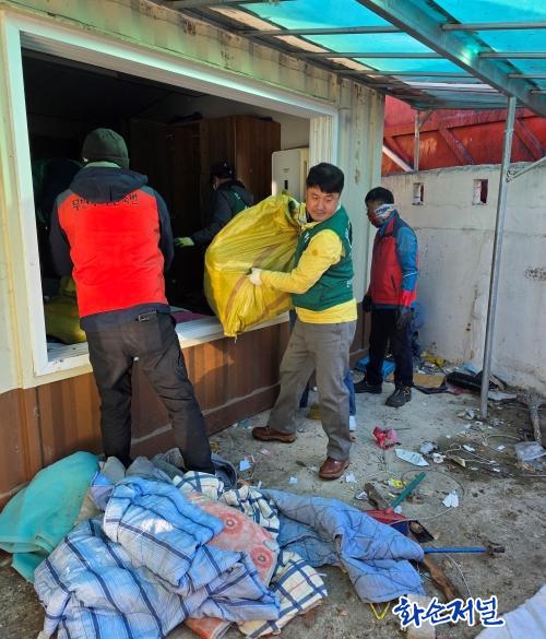 ù° ³¯¿¡´Â Àü±¹¹ÎÁÖ¿¬Çճ뵿Á¶ÇÕ È¼øÁöºÎ Á¶ÇÕ¿øÀΠȯ°æ¹ÌÈ¿ø 10¿© ¸íÀÌ Âü¿©ÇÏ¿© ÁßÀåºñ Áý°ÔÂ÷¿Í û¼ÒÂ÷ 2´ë¸¦ ÅõÀÔ, ÁÖ°Å ³»ºÎ¿Í ¿ÜºÎ¿¡ ½×¿© ÀÖ´ø Æó±â¹°À» ó¸®ÇÏ¿´´Ù.