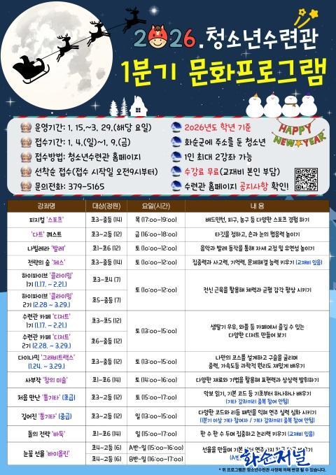 ÇÑÆí, 1¿ù 4ÀϺÎÅÍ 1¿ù 9ÀϱîÁö ȼø±ºÃ»¼Ò³â¼ö·Ã°ü ´©¸®Áý(https://hwasunyouth.kr/)¡®ÇÁ·Î±×·¥ ½Åû °Ô½ÃÆÇ¡¯À» ÅëÇØ ¿Â¶óÀÎÀ¸·Î Á¢¼öÇÏ¸é µÈ´Ù. 1ºÐ±â ÇÁ·Î±×·¥Àº 1¿ù 15ÀϺÎÅÍ 3¿ù 29ÀϱîÁö ¿î¿µµÇ¸ç, ȼø±º¿¡ ÁÖ¼Ò¸¦ µÐ û¼Ò³âÀº ´©±¸³ª Âü¿©ÇÒ ¼ö ÀÖ´Ù.