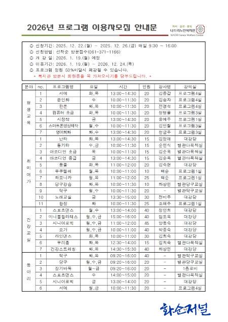 ÇÑÆí ³ªµå¸®³ëÀκ¹Áö°üÀº 2026³â ÇÁ·Î±×·¥ ÀÌ¿ëÀÚ ¸ðÁýÀ» ½ÃÀÛÇÑ´Ù. ¸ðÁý ºÐ¾ß´Â ¡ãÆò»ý±³À° ¡ãÃë¹Ì¿©°¡ ¡ã°Ç°±³½Ç µî 3°³ ºÐ¾ß·Î, ÃÑ 25°³ ÇÁ·Î±×·¥°ú 6°³ÀÇ µ¿¾Æ¸®°¡ ¿î¿µµÉ ¿¹Á¤ÀÌ´Ù. ÇÁ·Î±×·¥ ¹× µ¿¾Æ¸® ½ÅûÀº 12¿ù 22ÀÏ(¿ù)ºÎÅÍ 12¿ù 26ÀÏ(±Ý)±îÁö ¼±Âø¼ø ¹æ¹® Á¢¼ö·Î ÁøÇàµÇ¸ç, ½Åû ½Ã ȸ¿øÁõÀ» ¹Ýµå½Ã ÁöÂüÇØ¾ß ÇÑ´Ù.