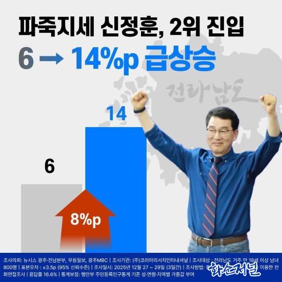 ½ÅÁ¤ÈÆ ÀÇ¿øÀº ¡°À̹ø Á¶»ç¿¡¼ Áö³ÇØ 1Â÷ ¿©·ÐÁ¶»ç ¶§º¸´Ù ¹«·Á 8%p »ó½ÂÇÑ 14%ÀÇ ¼±È£µµ¸¦ ±â·ÏÇß´Ù. Àü³²µµÁö»ç Ã⸶¸¦ ¼±¾ðÇÑ Áö ºÒ°ú 20ÀÏ ¸¸¿¡ ¼±È£µµ 2À§¿¡ ¿À¸¥ °ÍÀÌ´Ù. ½ÅÁ¤ÈÆÀÇ ÃßÁø·Â°ú ¼º°ú¸¦ ÀÎÁ¤ÇØÁֽŠ¿©·¯ºÐ ´öºÐÀÌ´Ù.¡±°í Çß´Ù.