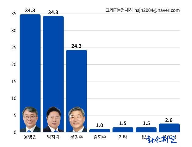 Á¶»ç¸¦ ÁÖ°üÇÑ ¸ÅÀϹæ¼Û¢ß ¿¡¹ö´º½º¿¡ µû¸£¸é À±¿µ¹Î Àü ºÎÀÇÀå(34.8%)°ú ÀÓÁö¶ô Àü¶ó³²µµÀÇ¿ø(34.3%)ÀÌ ±Ù¼ÒÇÑ Â÷ÀÌ·Î Ä¡¿ÇÑ Á¢ÀüÀ» ¹úÀÌ¸ç ¾ç° ±¸µµ¸¦ º¸À̰í ÀÖ´Ù, ¹®ÇàÁÖ Àü µµÀÇ¿ø(24.3%) ¿ª½Ã Å©Áö ¾ÊÀº °ÝÂ÷·Î ÇâÈÄ º¯¼ö¿¡ µû¸¥ È帧À» ¿¹ÃøÇÒ ¼ö ¾ø´Â »óȲÀÌ´Ù.
