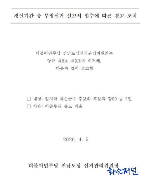 ±×·¯³ª Àü³²µµ´ç ¼±°Å°ü¸®À§¿øÈ¸°¡ ÀÓÁö¶ô ȼø±º¼ö ¿¹ºñÈĺ¸¿Í Èĺ¸Ãø °00µî 2Àο¡°Ô °æ°í Á¶Ä¡¸¦ ÃëÇϸé¼, ÇØ´ç »ç¾ÈÀ» ÀÓ ¿¹ºñÈĺ¸¿Í ¹«°üÇÑ ¹®Á¦·Î º¸±â´Â ¾î·Æ´Ù´Â ÆÇ´ÜÀÌ ¹Ý¿µµÈ °Í ¾Æ´Ï³Ä´Â ÇØ¼®ÀÌ ³ª¿À°í ÀÖ´Ù.