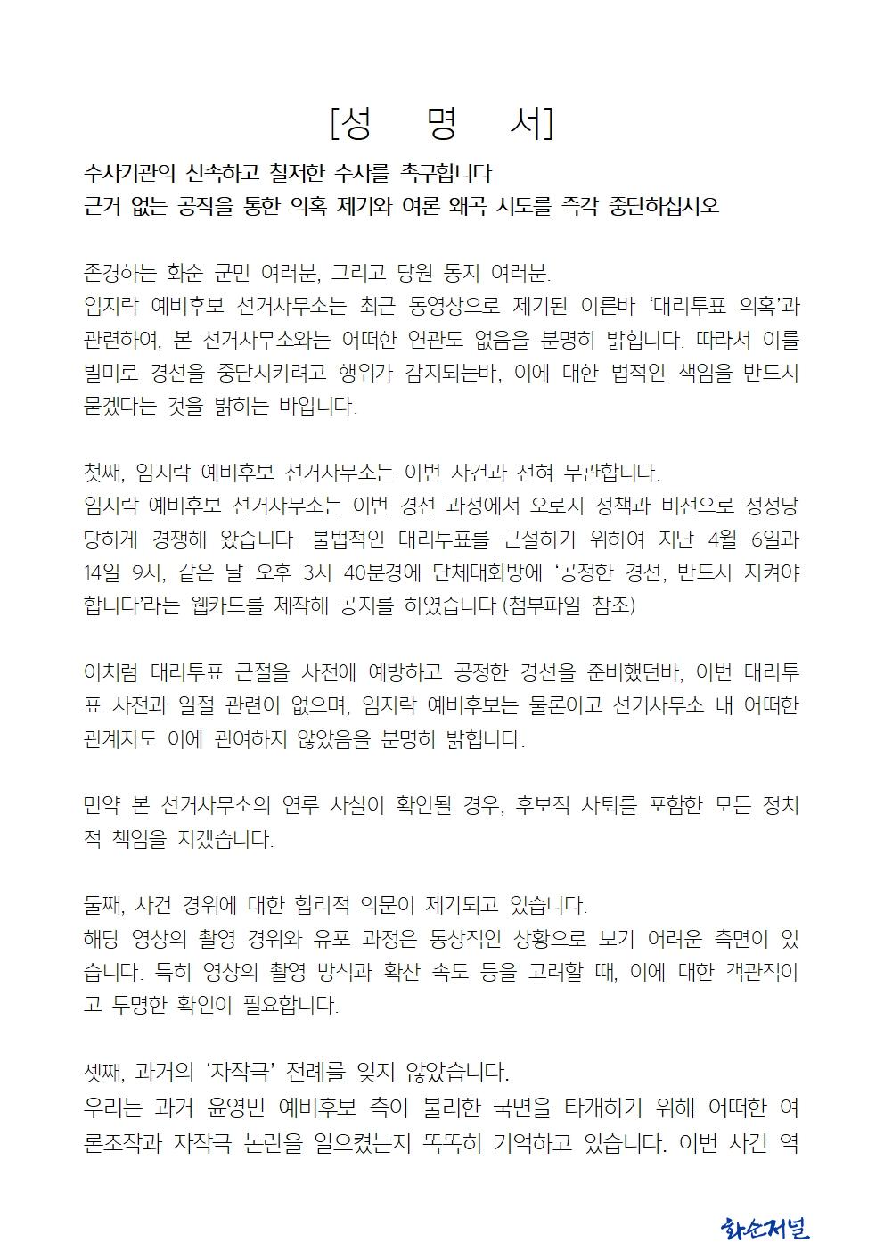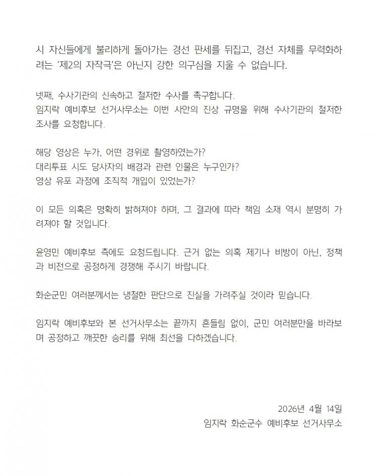 ÀÓÁö¶ô ¿¹ºñÈĺ¸ ¼±°Å»ç¹«¼Ò´Â 14ÀÏ ¹ßÇ¥ÇÑ ¼º¸í¼¿¡¼ ¡°ÃÖ±Ù µ¿¿µ»óÀ¸·Î Á¦±âµÈ À̸¥¹Ù ´ë¸®ÅõÇ¥ ÀÇȤ°ú º» ¼±°Å»ç¹«¼Ò´Â ¾î¶°ÇÑ °ü·Ãµµ ¾ø´Ù¡±¸ç ¡°À̸¦ ºô¹Ì·Î °æ¼±À» ÁߴܽÃŰ·Á´Â ½Ãµµ°¡ °¨ÁöµÇ´Â ¸¸Å ¹ýÀû Ã¥ÀÓÀ» ¹Ýµå½Ã ¹¯°Ú´Ù¡±°í ¹àÇû´Ù.