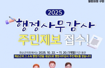ȼø±ºÀÇȸ(ÀÇÀå ¿ÀÇü¿)´Â 2025³âµµ ÇàÁ¤»ç¹«°¨»ç¸¦ ¾ÕµÎ°í, ÇàÁ¤ÀÇ Åõ¸í¼º°ú È¿À²¼º Á¦°í¸¦ À§ÇØ ÁֹεéÀÇ Á¦º¸¸¦ Á¢¼öÇÑ´Ù. Á¦º¸ Á¢¼ö ±â°£Àº ¿À´Â 11¿ù 20ÀϱîÁöÀ̸ç, Áö¿ªÁÖ¹ÎÀº ¹°·Ð ½Ã¹Î´Üü ¹× »çȸ´Üü ´©±¸³ª Âü¿©ÇÒ ¼ö ÀÖ´Ù. Á¦º¸´ë»óÀº¡¦