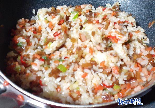 ¾ç¼Õ¿¡ À§»ýÀå°©À» ³¢°í ¹äÀ» ÇÑ Áܾ¿ ¹¶ÃÄ Å¸¿øÇüÀ¸·Î ¸¸µç´Ù. ±èÀº 1.5cm Á¤µµ ³ÐÀÌ·Î ½ä¾î ÁָԹ信 »Ñ·ÁÁØ´Ù. ¿Ï¼ºÀÌ µÆ´Ù¸é Á¢½Ã¿¡ ´ã¾Æ ¸ÀÀÖ°Ô ¸ÔÀ¸¸é µÈ´Ù.