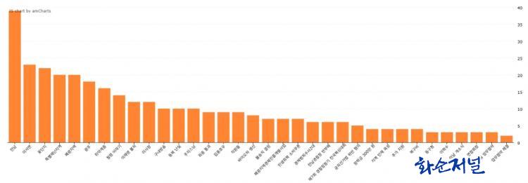 ±â»ç °Ç¼ö¿¡ ±Ù°ÅÇÑ ¸·´ë±×·¡ÇÁ¿¡¼ ÃâÇöºóµµ(ºÐ¼® ±â»ç¿¡¼ ¿¬°ü¾îÀÇ ÃâÇö Ƚ¼ö)°¡ ÀæÀº ¿¬°ü¾î¿Í ±× ºóµµ´Â ³»¸²Â÷¼øÀ¸·Î °¢°¢ Àü³² 39ȸ, À̼¸é 23ȸ, ²É´ÜÁö 22ȸ, Ưº°Àç³Áö¿ª 20ȸ, Æó±¤Áö¿ª 20ȸ, ±¤ÁÖ 18ȸ, Ãë¾à°èÃþ 16ȸ, û·Å À̾߱â 14ȸ, ÀÌÀ翵 ºÒÀÚ 12ȸ, ÀÌ»çÀå 12ȸ µîÀÌ´Ù. ¿¬°ü¾î 34°³ÀÇ ÃÑ ÃâÇöºóµµ´Â 338ȸ´Ù.