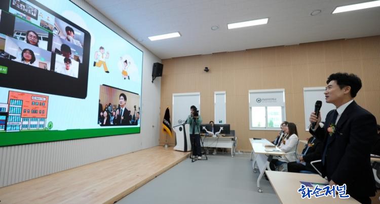 Àü³²¿Â¶óÀÎÇб³ 4Ãþ ¹Ìµð¾îȦ¿¡¼ ÁøÇàµÈ °³±³½Ä¿¡´Â ±è´ëÁß Àü³²±³À°°¨ÀÌ Âü¼®ÇØ ¹®ÀºÈñ ±³Àå¿¡°Ô ±³±â¸¦ Àü´ÞÇÏ°í °ü°èÀÚµéÀ» °Ý·ÁÇÏ¿´À¸¸ç, ¿Â¶óÀÎ ¼ö¾÷À» ½Ç½Ã°£À¸·Î Âü°üÇϰí Çлýµé°ú Á÷Á¢ ´ëȸ¦ ³ª´©¸ç ¿Â¶óÀÎ ¼ö¾÷ÀÇ ¿î¿µ ¹æ½Ä°ú ¸¸Á·µµ¿¡ ´ëÇÑ ÇöÀåÀÇ ¸ñ¼Ò¸®¸¦ µé¾ú´Ù. À̿ܿ¡µµ Àü³²µµÀÇȸ ±³À°À§¿øÀåÀ» ºñ·ÔÇÑ ±³À°Áö¿øÃ», Áö¿ª Çб³ °ü°èÀÚ µîÀÌ Âü¼®ÇÏ¿´À¸¸ç, °³±³½ÄÀ» ¿Â¶óÀÎÀ¸·Î »ýÁß°èÇÏ¿© ´Ù¾çÇÑ ±³À° ÁÖüµé°ú ÇÔ²²ÇÏ´Â ÀÇ¹Ì ÀÖ´Â ÀÚ¸®°¡ µÆ´Ù.