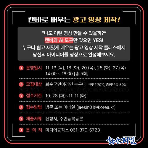 ±³À° ÀÏÁ¤Àº 11¿ù 13ÀÏ(¸ñ)ºÎÅÍ 27ÀÏ(¸ñ)±îÁö ÃÑ 5ȸ¿¡ °ÉÃÄ ¿ÀÈÄ 2½ÃºÎÅÍ 4½Ã±îÁö ÁøÇàµÇ¸ç, ±³À°»ýµéÀº ¹è¿î ³»¿ëÀ» ¹ÙÅÁÀ¸·Î È«º¸³ª SNS ÄÜÅÙÃ÷ Á¦ÀÛ¿¡ ¹Ù·Î Ȱ¿ëÇÒ ¼ö ÀÖ´Â ½Ç¹« ¿ª·®À» ÀÍÈ÷°Ô µÈ´Ù.
