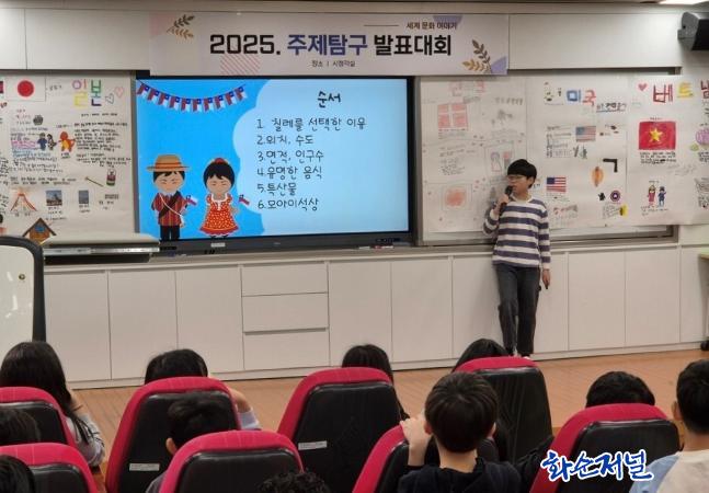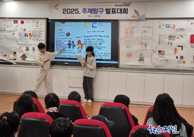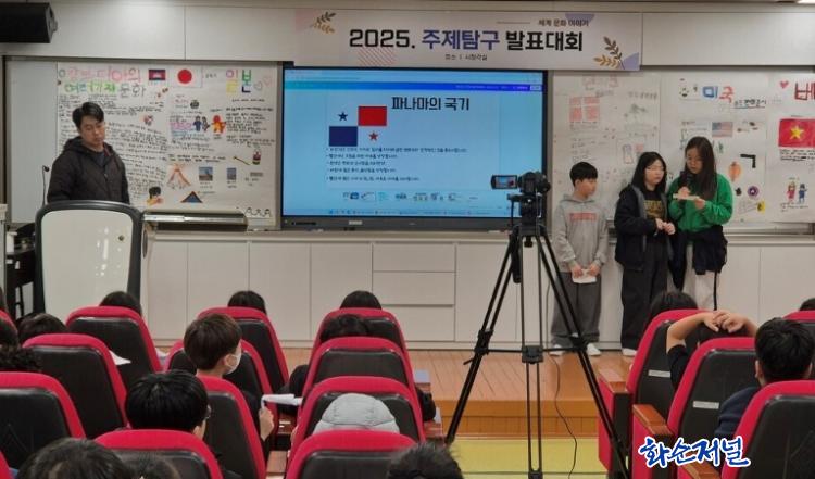 Çб³ Ư»ö±³À°ÀÎ ÁÖÁ¦Å½±¸ ¹ßÇ¥´ëȸ´Â 1Çб⿡ ¡®±¹±â °ñµçº§¡¯À» ÅëÇØ Àü ¼¼°è ±¹±â¿¡ ´ëÇÑ ÄûÁî ´ëȸ¸¦ ¿î¿µÇßÀ¸¸ç, 2Çб⿡´Â Çг⺰·Î 2~3¸íÀÇ ÇлýÀÌ ÆÀÀ» ÀÌ·ç¾î ÇÑ ³ª¶ó¸¦ ¼±ÅÃÇØ ¹ßÇ¥ ÀڷḦ Á¦ÀÛÇÏ°í ¹ßÇ¥ÇÏ´Â Çü½ÄÀ¸·Î ÁøÇàµÆ´Ù. ¹ßÇ¥ ÀÚ·á´Â Æ÷½ºÅÍ, ÇÁ·¹Á¨Å×ÀÌ¼Ç µî ÇлýµéÀÌ ÀÚÀ¯·Ó°Ô Á¦ÀÛÇßÀ¸¸ç, Ä£±¸µé°úÀÇ ÁúÀÇÀÀ´ä ½Ã°£µµ Æ÷ÇԵƴÙ.