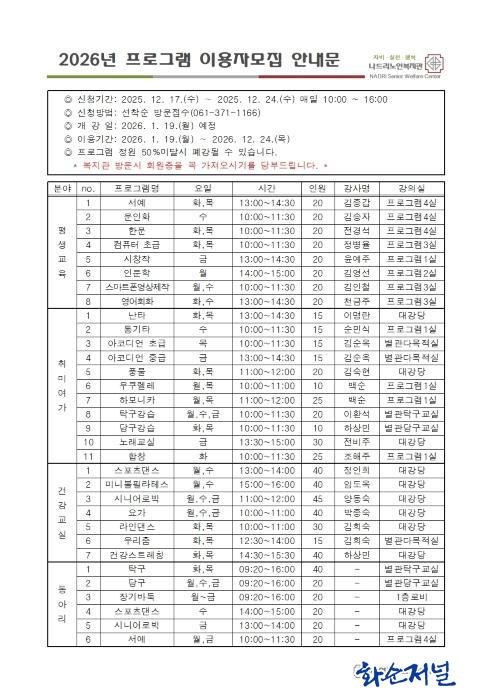 ¸ðÁý ºÐ¾ß´Â Æò»ý±³À°, Ãë¹Ì¿©°¡, °Ç°±³½Ç µî 3°³ ºÐ¾ß, ÃÑ 26°³ ÇÁ·Î±×·¥ ¹× 6°³ÀÇ µ¿¾Æ¸®ÀÌ´Ù. ÇÁ·Î±×·¥ ¹× µ¿¾Æ¸® ½ÅûÀº 12¿ù 17ÀÏ(¼ö) ¿ÀÀü 10½ÃºÎÅÍ ½ÃÀ۵Ǹç 12¿ù 24ÀÏ(¼ö) 16½Ã±îÁö ¼±Âø¼ø ¹æ¹®Á¢¼ö ¹ÞÀ¸¸ç ȸ¿øÁõÀ» Çʼö·Î ÁöÂüÇÏ¿©¾ß ÇÑ´Ù.