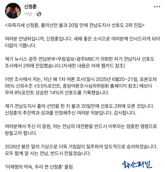 ![]() ½ÅÁ¤ÈÆ ÀÇ¿øÀÌ Àü³²Áö»ç ¼±È£µµ Á¶»ç¿¡¼ 2À§¿¡ ÁøÀÔÇß´Ù°í ¹àÈù SNS Àü¹®. |