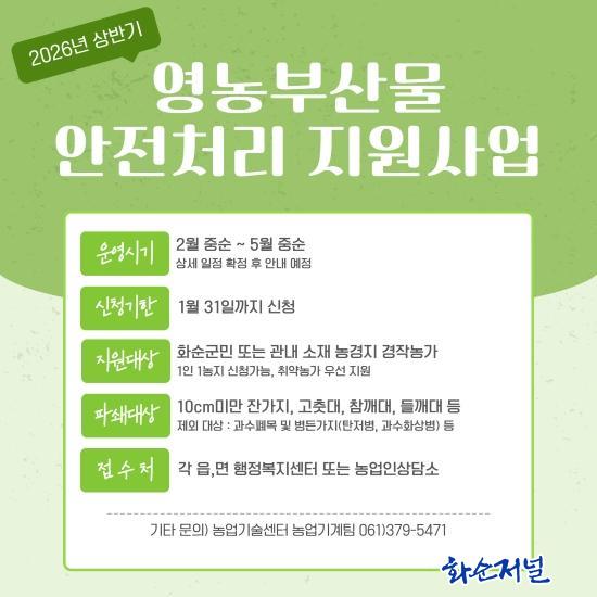 ȼø±ºÀº ¿µ³óºÎ»ê¹° ¾ÈÀüó¸® Áö¿ø´ÜÀ» »ó¹Ý±â(2¿ù~5¿ù)¿Í ÇϹݱâ(11¿ù~12¿ù)·Î ³ª´©¾î ¿î¿µÇÒ °èȹÀÌ´Ù. À̸¦ ÅëÇØ ³ó¾÷Àε鿡°Ô 1ÀÎ 1³óÁö¸¦ ±âÁØÀ¸·Î Àܰ¡Áö, °íÃå´ë µî ³ó¾÷ºÎ»ê¹° ÆÄ¼â ÀÛ¾÷À» Áö¿øÇϸç, °í·É³ó¾÷Àΰú Ãë¾à°èÃþÀ» ¿ì¼±À¸·Î ¹«»ó Áö¿øÇÒ ¿¹Á¤ÀÌ´Ù.