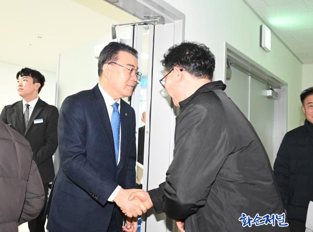 ½ÅÁ¤ÈÆ Çà¾ÈÀ§¿øÀåÀÌ °Ý·ÁÀÇ Àλ縻À» ÀüÇϰí ÀÖ´Ù. |