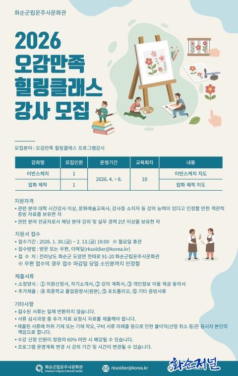 À̹ø °»ç ¸ðÁýÀº ¼ºÀÎ ´ë»ó ¹®È¿¹¼ú Èú¸µ ±³À° ÇÁ·Î±×·¥ ¿î¿µÀ» À§ÇÑ °ÍÀÌ´Ù. ¿¹¼ú Ȱµ¿À» ÅëÇØ ÀÏ»óÀÇ °¨°¢À» ȸº¹Çϰí Á¤¼Àû ¾ÈÁ¤À» µµ¿ï ¼ö ÀÖ´Â ¿ª·® ÀÖ´Â °»ç¸¦ ¼±¹ßÇÒ °èȹÀÌ´Ù.