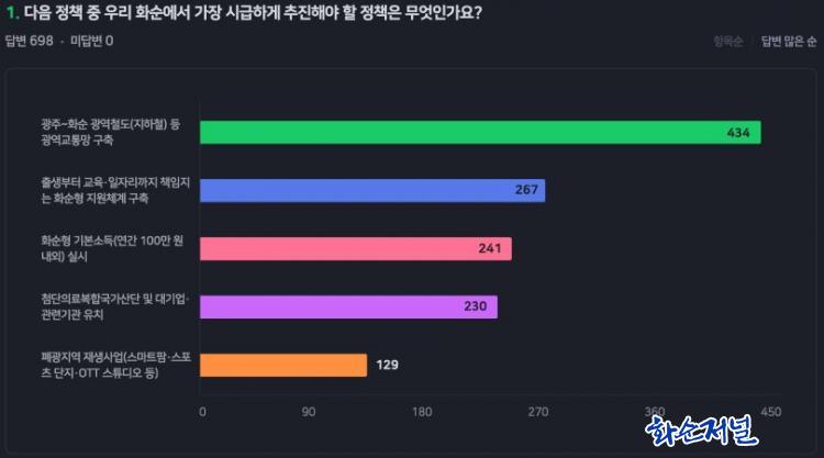 ÀÓ ÀÇ¿ø Ãø¿¡ µû¸£¸é À̹ø ¼³¹®¿¡´Â ÃÑ 746°ÇÀÇ ÀÀ´äÀÌ Á¢¼öµÆÀ¸¸ç, ÀÌ °¡¿îµ¥ ¹«È¿¡¤Áߺ¹ ÀÀ´ä 48°ÇÀ» Á¦¿ÜÇÑ 698°ÇÀÌ À¯È¿ ÀÀ´äÀ¸·Î Áý°èµÆ´Ù. À¯È¿ ÀÀ´ä Áß ±¤ÁÖ~ȼø ±¤¿ªÃ¶µµ(ÁöÇÏö) À¯Ä¡°¡ 434°ÇÀ¸·Î °¡Àå ¸¹Àº ¼±ÅÃÀ» ¹Þ¾Æ 1À§¸¦ Â÷ÁöÇß´Ù.