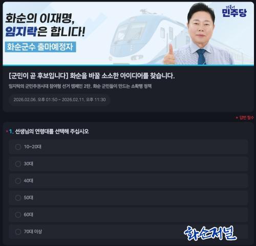 ÇÑÆí, ȼø±º¼ö Ã⸶¿¹Á¤ÀÚÀÎ ÀÓÁö¶ô µµÀÇ¿øÀº Áö³ ´Þ ÁøÇàÇÑ ¡®´ëÇ¥°ø¾à ¿Â¶óÀÎ ¼³¹®¡¯À» ÅëÇØ ±¤ÁÖ~ȼø ±¤¿ªÃ¶µµ(ÁöÇÏö)¿Í ±¤¿ª±³Åë¸Á È®ÃæÀ» ´ëÇ¥°ø¾àÀ¸·Î »ï¾ÒÀ¸¸ç, ¼±°Å ±â°£ Áß ÁֹΠÂü¿© Ä·ÆäÀÎÀ» ÅëÇØ ±º¹ÎÁֱǽô븦 ¿°í, ȼøÀÇ ¼±°Å ¹®È¸¦ ¹Ù²Ù°Ú´Ù°í °Åµì Æ÷ºÎ¸¦ ¹àÈ÷°í ÀÖ´Ù.