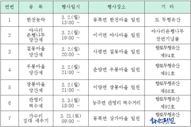 ÀüÅë ¹Î¼ÓÇà»ç´Â ȼø±º °ü³» 7°³ÀÇ ¸é¿¡¼ °¢°¢ °³ÃֵǸç, Çà»ç Á¾¸ñ°ú °³ÃÖ ³¯Â¥ µî ¼¼ºÎ ³»¿ëÀº ¾Æ·¡ Ç¥¸¦ Âü°íÇÏ¸é µÈ´Ù.