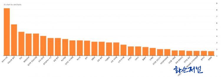 ±â»ç °Ç¼ö¿¡ ±Ù°ÅÇÑ ¸·´ë±×·¡ÇÁ¿¡¼ ÃâÇöºóµµ(ºÐ¼® ±â»ç¿¡¼ ¿¬°ü¾îÀÇ ÃâÇö Ƚ¼ö)°¡ ÀæÀº ¿¬°ü¾î¿Í ±× ºóµµ´Â ³»¸²Â÷¼øÀ¸·Î °¢°¢ Àü³² 134ȸ, ±¤ÁÖ 85ȸ, ´ÜüÀå 45ȸ, ÃÖ¿ì¼ö±â°ü 21ȸ, ÇàÁ¤¾ÈÀüºÎ 18ȸ µîÀÌ´Ù. ¶ÇÇÑ, ¿¬°ü¾î 29°³ÀÇ ÃÑ ÃâÇöºóµµ´Â 441ȸ´Ù.