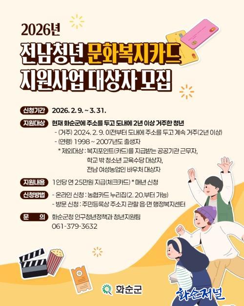 ÀÚ¼¼ÇÑ »çÇ×Àº ȼø±ºÃ» ´©¸®Áý(https://www.hwasun.go.kr), û³â¼¾ÅÍ ´©¸®Áý(https://www.hwasun.go.kr/youth) °øÁö »çÇ×À» Âü°íÇϰųª, ȼø±ºÃ» Àα¸ û³âÁ¤Ã¥°ú û³âÁö¿øÆÀ(¢Ï061-379-3632)À¸·Î ¹®ÀÇÇÏ¸é µÈ´Ù.