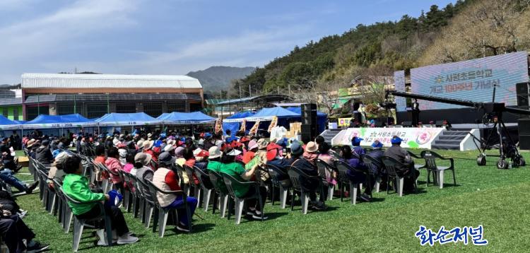À̾îÁø °³È¸½Ä¿¡¼´Â ´ëȸ»ç¿Í ±â³ä»ç µîÀ» ÅëÇØ 100ÁÖ³âÀÇ Àǹ̸¦ µÇ»õ±â°í Çб³ÀÇ ¹ßÀüÀ» ±â¿øÇß´Ù. ¶ÇÇÑ Çб³ ¹ßÀü¿¡ ±â¿©ÇÑ µ¿¹®°ú Áö¿ª Àλ翡°Ô °ø·ÎÆÐ¿Í °¨»çÆÐ¸¦ ¼ö¿©ÇÏ¸ç ±×°£ÀÇ Çå½Å¿¡ °¨»ç¸¦ ÀüÇß´Ù. ƯÈ÷ 100ÀÎ ÇÕâ´ÜÀÇ ±³°¡ Á¦Ã¢Àº Âü¼®Àڵ鿡°Ô ±íÀº °¨µ¿°ú ÀÚ±à½ÉÀ» ¾È°å´Ù.