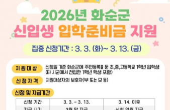 ȼø±º(±º¼ö ±¸º¹±Ô)Àº 2026Çг⵵ ÃÊ‧Áß‧°íµîÇб³ ½ÅÀÔ»ý °¡Á¤ÀÇ ±³À°ºñ ºÎ´ãÀ» ¿ÏÈÇÏ°í º¸ÆíÀû ±³À°º¹Áö¸¦ ½ÇÇöÇϱâ À§ÇØ ÀÔÇÐÁغñ±Ý 1Àδç 20¸¸ ¿øÀ» ȼø»ç¶û»óǰ±ÇÀ¸·Î Áö¿øÇÑ´Ù°í 27ÀÏ ¹àÇû´Ù. Áö¿ø ´ë»óÀº »ç¾÷ ±â°£ ³» ½ÅûÀÏ¡¦